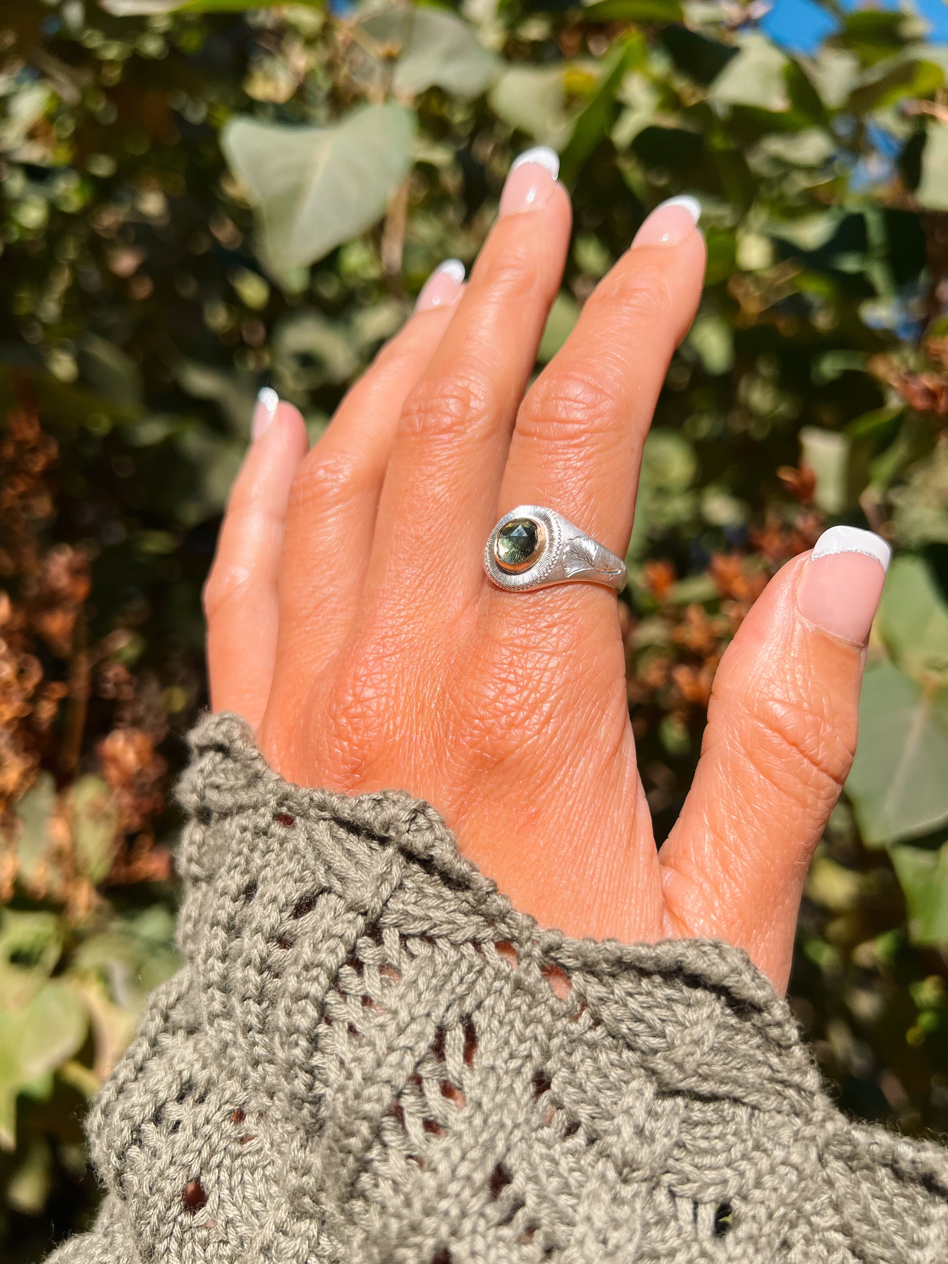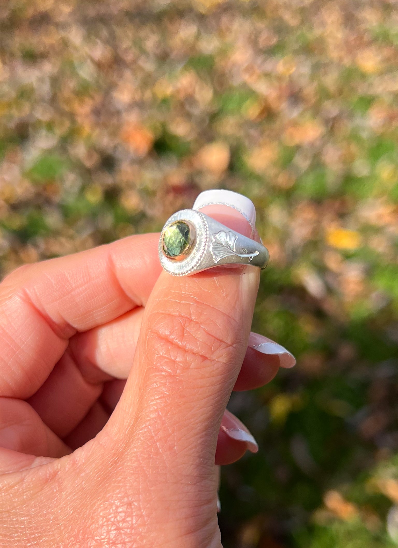 Engraved to capture light around the stone with Ginkgo leaves on the band. Ginkgo symbolism includes longevity, hope, and peace.