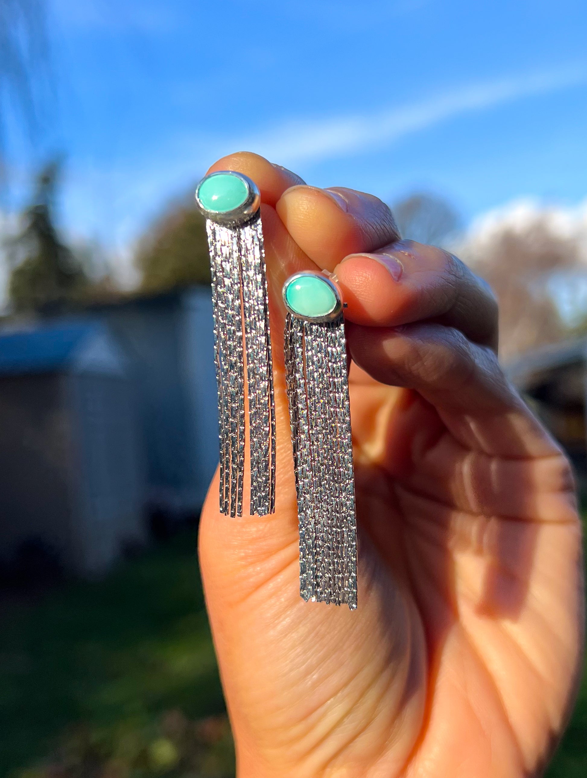 Verde Valley Turquoise set in sterling silver with sterling silver posts, rhodium plated fringe jackets.